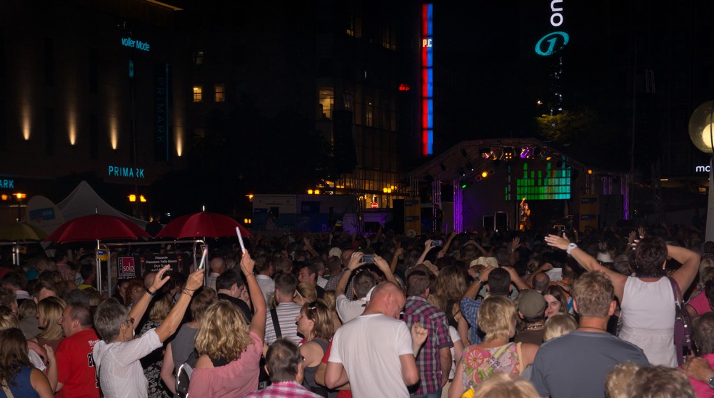 7000 Menschen waren zur Jubiläumsparty von Rhyr´tmus der Nacht nach Essen gekommen und feierten auf dem Kennedyplatz bei heißem sommerwetter eine tolle Party mit den 25 Künstlern. Zum Schluß kam der Überraschungsgast Andrea Berg.