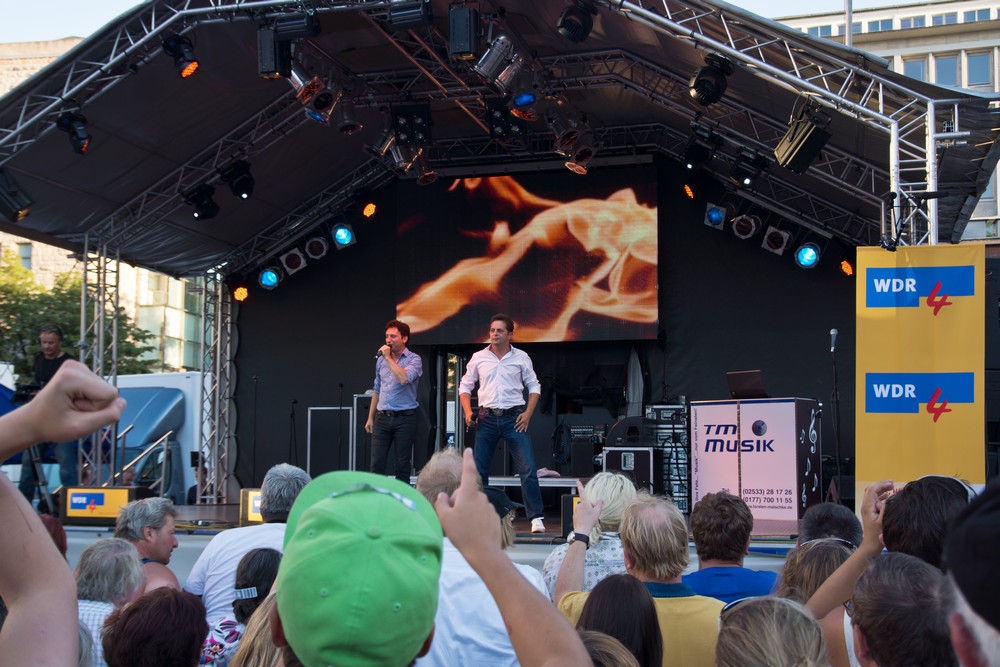 7000 Menschen waren zur Jubiläumsparty von Rhyr´tmus der Nacht nach Essen gekommen und feierten auf dem Kennedyplatz bei heißem sommerwetter eine tolle Party mit den 25 Künstlern. Zum Schluß kam der Überraschungsgast Andrea Berg.