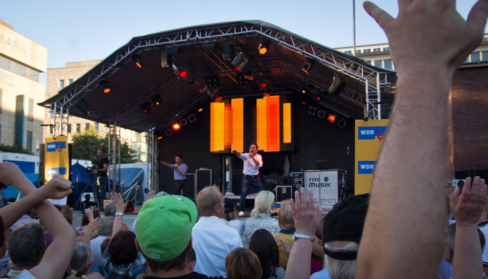 7000 Menschen waren zur Jubiläumsparty von Rhyr´tmus der Nacht nach Essen gekommen und feierten auf dem Kennedyplatz bei heißem sommerwetter eine tolle Party mit den 25 Künstlern. Zum Schluß kam der Überraschungsgast Andrea Berg.