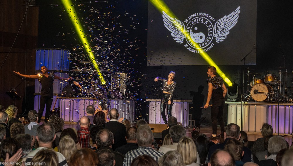 30 Jahre Leidenschaft Alexandra & Anita Hofmann Konzert Reutlingen In der wunderschönen Stadthalle von Reutlingen feierten ca. 2000 Musikbegeisterte Alexandra & Anita Hofmann deren 30. Bühnenjubiläum. Band Tänzer und Tänzerinnen zeigten ein Feuerwerk von Musik, Gesang und Tanz, es war ein erlebnis. Toll wenn man sieht, wie die Hofmanns freundschaftlich mit ihren Fans umgehen. |