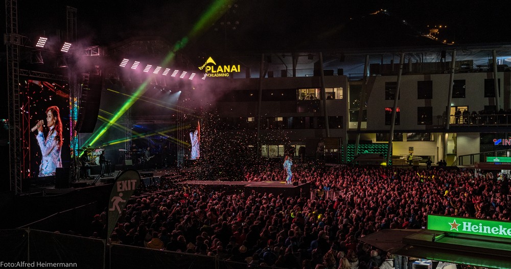 Andrea Berg Schladming/Steiermark Schladming Planai 23.3.2019 5000 Ski-u. Schlagerfreunde feierten im Partyzentrum von Schladming, im Planai Stadion Andrea Berg mit ihrer Band. Vorher heizte die Rebel Tell Band die Stimmung an. Vor dem Konzert bekam Andrea von der Bürgermeisterin von Schladming Planai Ski und einen Blumenstrauß geschenkt. |