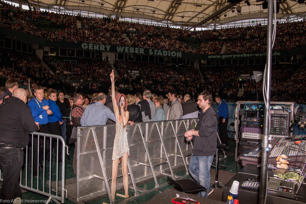 Atlantis Finale HalleWestfalen Gerry Weber Stadion Ausverkaufte Gerry weber Stadion beim Tourfinale von Atlantis in Halle/W. Mit Verspätung, weil man die Sommerzeit nicht eingeplant hatte, ging die Show los und es wurde eine schöne Abschlußshow. Die Crew hatte viele Andreafiguren verteilt, was Andrera dann überraschte und es gab einige weitere Abweichungen im Programm. |