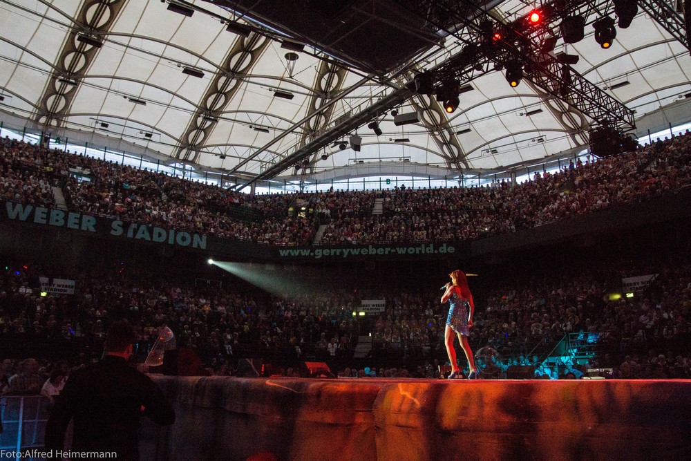 Atlantis Finale HalleWestfalen Gerry Weber Stadion Ausverkaufte Gerry weber Stadion beim Tourfinale von Atlantis in Halle/W. Mit Verspätung, weil man die Sommerzeit nicht eingeplant hatte, ging die Show los und es wurde eine schöne Abschlußshow. Die Crew hatte viele Andreafiguren verteilt, was Andrera dann überraschte und es gab einige weitere Abweichungen im Programm. |