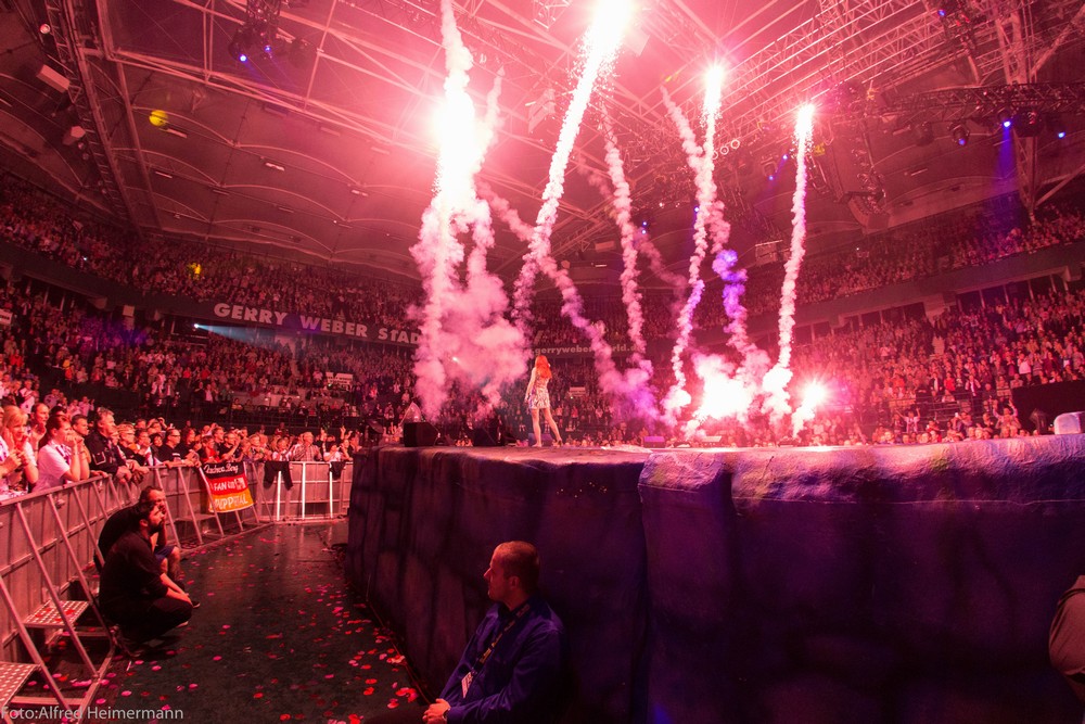 Atlantis Finale HalleWestfalen Gerry Weber Stadion Ausverkaufte Gerry weber Stadion beim Tourfinale von Atlantis in Halle/W. Mit Verspätung, weil man die Sommerzeit nicht eingeplant hatte, ging die Show los und es wurde eine schöne Abschlußshow. Die Crew hatte viele Andreafiguren verteilt, was Andrera dann überraschte und es gab einige weitere Abweichungen im Programm. |