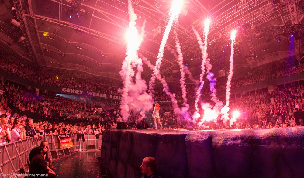 Atlantis Finale HalleWestfalen Gerry Weber Stadion Ausverkaufte Gerry weber Stadion beim Tourfinale von Atlantis in Halle/W. Mit Verspätung, weil man die Sommerzeit nicht eingeplant hatte, ging die Show los und es wurde eine schöne Abschlußshow. Die Crew hatte viele Andreafiguren verteilt, was Andrera dann überraschte und es gab einige weitere Abweichungen im Programm. |