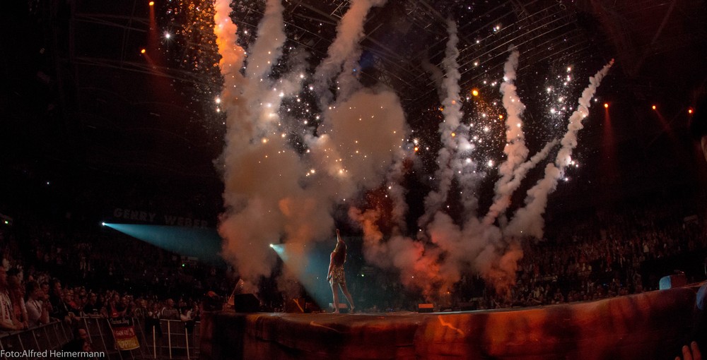 Atlantis Finale HalleWestfalen Gerry Weber Stadion Ausverkaufte Gerry weber Stadion beim Tourfinale von Atlantis in Halle/W. Mit Verspätung, weil man die Sommerzeit nicht eingeplant hatte, ging die Show los und es wurde eine schöne Abschlußshow. Die Crew hatte viele Andreafiguren verteilt, was Andrera dann überraschte und es gab einige weitere Abweichungen im Programm. |