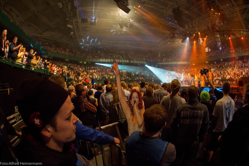 Atlantis Finale HalleWestfalen Gerry Weber Stadion Ausverkaufte Gerry weber Stadion beim Tourfinale von Atlantis in Halle/W. Mit Verspätung, weil man die Sommerzeit nicht eingeplant hatte, ging die Show los und es wurde eine schöne Abschlußshow. Die Crew hatte viele Andreafiguren verteilt, was Andrera dann überraschte und es gab einige weitere Abweichungen im Programm. |