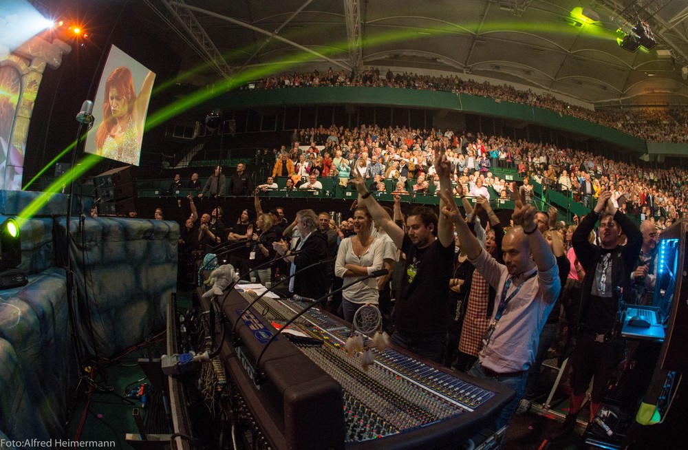 Atlantis Finale HalleWestfalen Gerry Weber Stadion Ausverkaufte Gerry weber Stadion beim Tourfinale von Atlantis in Halle/W. Mit Verspätung, weil man die Sommerzeit nicht eingeplant hatte, ging die Show los und es wurde eine schöne Abschlußshow. Die Crew hatte viele Andreafiguren verteilt, was Andrera dann überraschte und es gab einige weitere Abweichungen im Programm. |
