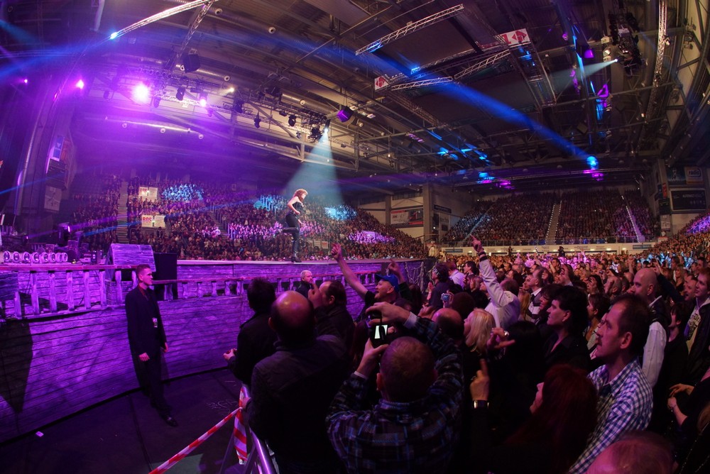 Konzert Bamberg Konzert Bamberg In der Arena Bamberg waren über 8000 Franken zur Abenteuershow gekommen, auch hier war die Halle ausverkauft, trotz Außentemperaturen von Minus 16°. Andrea konnte nicht fliegen, da die Technik dafür ausgefallen war. |