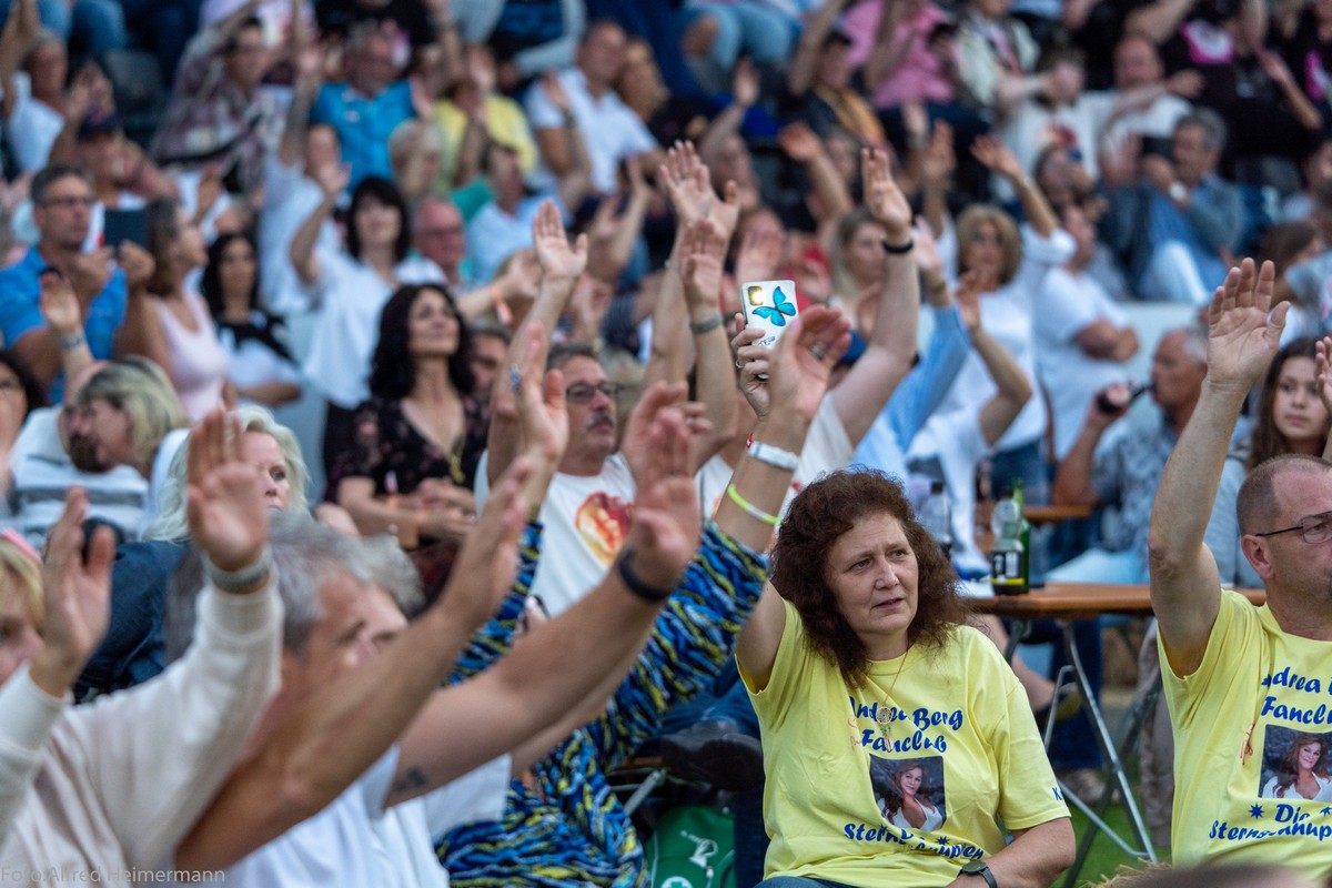 Openair Andrea Berg Aspach Das besondere Heimspiel, 17. Juli Wieder durften 2000 Fans Andrea auf der Bühne im Stadion der "Wir machen Druck" Arena bei sommerlichen Temperaturen feiern und für zwei Stunden den Alltag vergessen und trotzdem waren die Gedanken bei den Opfern der Flutkatastrophe, auch bei Andrea. |