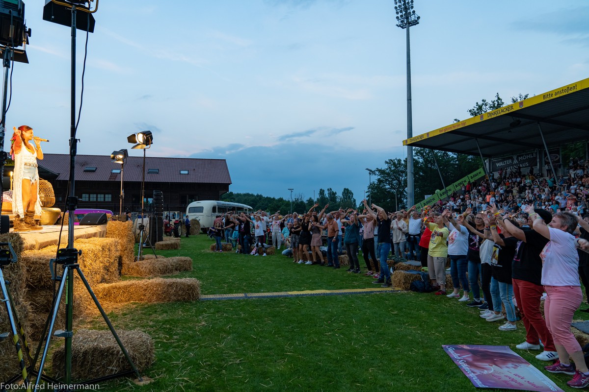Openair Andrea Berg Aspach Das besondere Heimspiel, 17. Juli Wieder durften 2000 Fans Andrea auf der Bühne im Stadion der "Wir machen Druck" Arena bei sommerlichen Temperaturen feiern und für zwei Stunden den Alltag vergessen und trotzdem waren die Gedanken bei den Opfern der Flutkatastrophe, auch bei Andrea. |