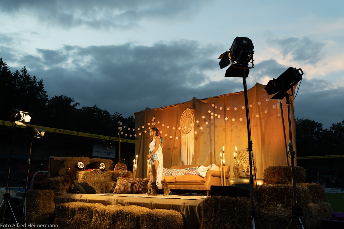 Openair Andrea Berg Aspach Das besondere Heimspiel, 17. Juli Wieder durften 2000 Fans Andrea auf der Bühne im Stadion der "Wir machen Druck" Arena bei sommerlichen Temperaturen feiern und für zwei Stunden den Alltag vergessen und trotzdem waren die Gedanken bei den Opfern der Flutkatastrophe, auch bei Andrea. |