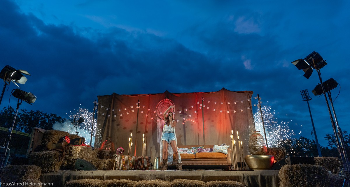 Openair Andrea Berg Aspach Das besondere Heimspiel, 17. Juli Wieder durften 2000 Fans Andrea auf der Bühne im Stadion der "Wir machen Druck" Arena bei sommerlichen Temperaturen feiern und für zwei Stunden den Alltag vergessen und trotzdem waren die Gedanken bei den Opfern der Flutkatastrophe, auch bei Andrea. |