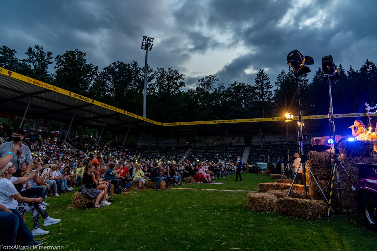Openair Andrea Berg Aspach Das besondere Heimspiel, 17. Juli Wieder durften 2000 Fans Andrea auf der Bühne im Stadion der "Wir machen Druck" Arena bei sommerlichen Temperaturen feiern und für zwei Stunden den Alltag vergessen und trotzdem waren die Gedanken bei den Opfern der Flutkatastrophe, auch bei Andrea. |