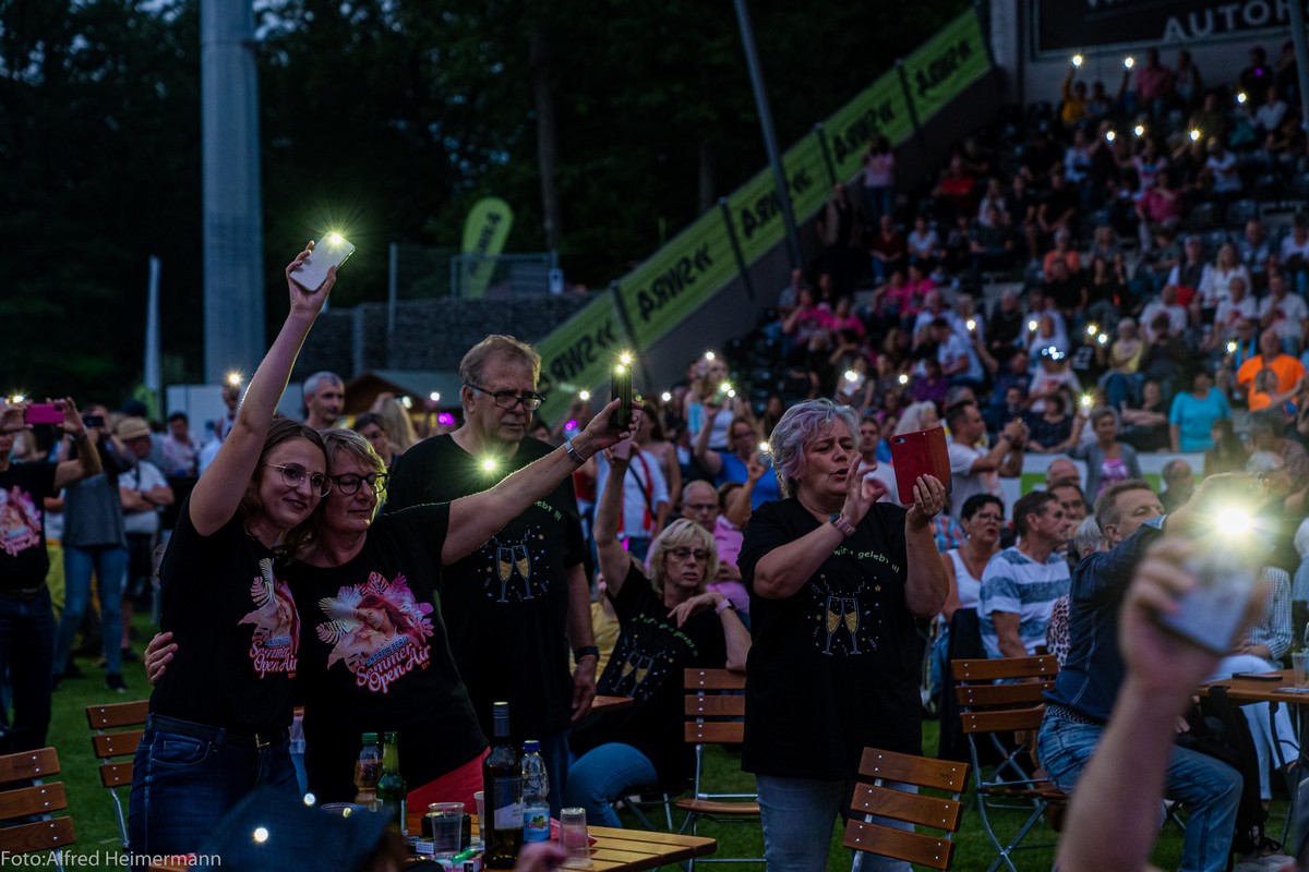 Openair Andrea Berg Aspach Das besondere Heimspiel, 17. Juli Wieder durften 2000 Fans Andrea auf der Bühne im Stadion der "Wir machen Druck" Arena bei sommerlichen Temperaturen feiern und für zwei Stunden den Alltag vergessen und trotzdem waren die Gedanken bei den Opfern der Flutkatastrophe, auch bei Andrea. |