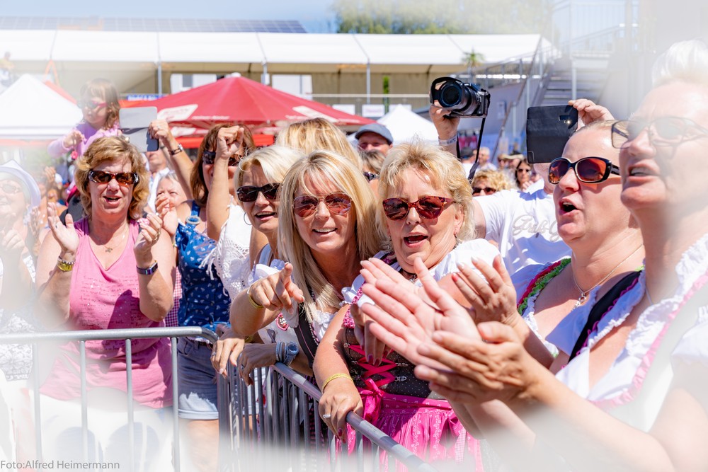 Zum Frühschoppen am Tag nachdem Schlager in Weiss kamen wieder ca.1500 Partyfreunde zum musikalischen Frühschoppen. Ochs am Spieß mit Knödel und Blaukraut war der Hit aus dem Catering von Stadelmann, aber auch gegrillte Ente war im Angebot. 15 Künstler traten in der Zeit von 13-17 Uhr auf, diesmal mit dem Scxhwerpunkt von Alpenrock. Es war ein schöner Tag!