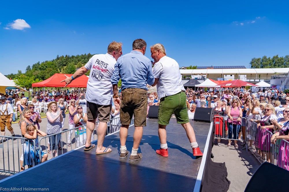 Zum Frühschoppen am Tag nachdem Schlager in Weiss kamen wieder ca.1500 Partyfreunde zum musikalischen Frühschoppen. Ochs am Spieß mit Knödel und Blaukraut war der Hit aus dem Catering von Stadelmann, aber auch gegrillte Ente war im Angebot. 15 Künstler traten in der Zeit von 13-17 Uhr auf, diesmal mit dem Scxhwerpunkt von Alpenrock. Es war ein schöner Tag!