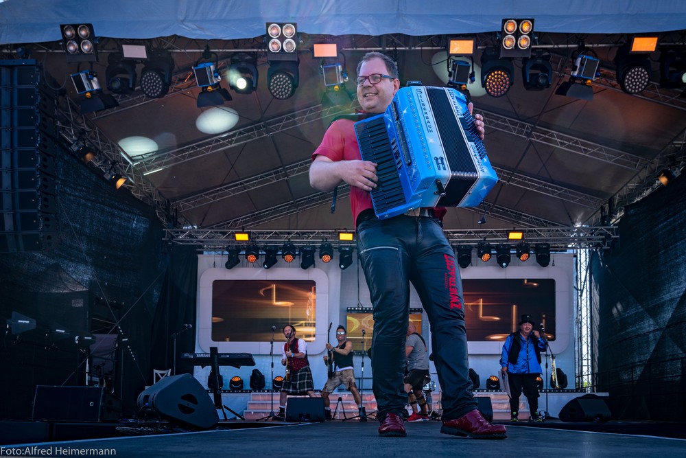 Zum Frühschoppen am Tag nachdem Schlager in Weiss kamen wieder ca.1500 Partyfreunde zum musikalischen Frühschoppen. Ochs am Spieß mit Knödel und Blaukraut war der Hit aus dem Catering von Stadelmann, aber auch gegrillte Ente war im Angebot. 15 Künstler traten in der Zeit von 13-17 Uhr auf, diesmal mit dem Scxhwerpunkt von Alpenrock. Es war ein schöner Tag!