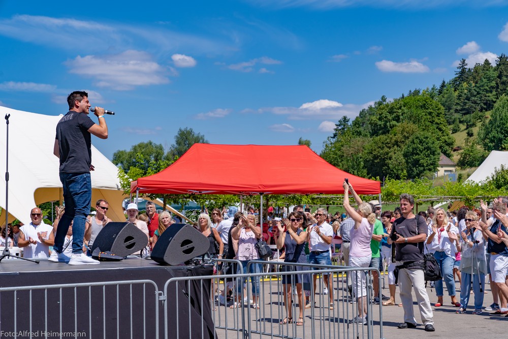 Zum Frühschoppen am Tag nachdem Schlager in Weiss kamen wieder ca.1500 Partyfreunde zum musikalischen Frühschoppen. Ochs am Spieß mit Knödel und Blaukraut war der Hit aus dem Catering von Stadelmann, aber auch gegrillte Ente war im Angebot. 15 Künstler traten in der Zeit von 13-17 Uhr auf, diesmal mit dem Scxhwerpunkt von Alpenrock. Es war ein schöner Tag!