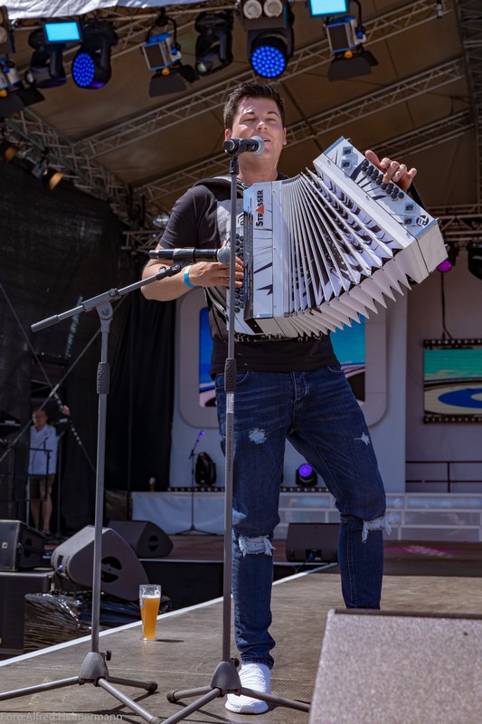 Zum Frühschoppen am Tag nachdem Schlager in Weiss kamen wieder ca.1500 Partyfreunde zum musikalischen Frühschoppen. Ochs am Spieß mit Knödel und Blaukraut war der Hit aus dem Catering von Stadelmann, aber auch gegrillte Ente war im Angebot. 15 Künstler traten in der Zeit von 13-17 Uhr auf, diesmal mit dem Scxhwerpunkt von Alpenrock. Es war ein schöner Tag!