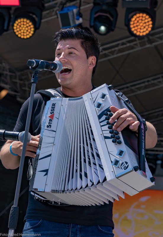 Zum Frühschoppen am Tag nachdem Schlager in Weiss kamen wieder ca.1500 Partyfreunde zum musikalischen Frühschoppen. Ochs am Spieß mit Knödel und Blaukraut war der Hit aus dem Catering von Stadelmann, aber auch gegrillte Ente war im Angebot. 15 Künstler traten in der Zeit von 13-17 Uhr auf, diesmal mit dem Scxhwerpunkt von Alpenrock. Es war ein schöner Tag!