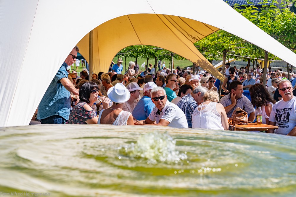 Zum Frühschoppen am Tag nachdem Schlager in Weiss kamen wieder ca.1500 Partyfreunde zum musikalischen Frühschoppen. Ochs am Spieß mit Knödel und Blaukraut war der Hit aus dem Catering von Stadelmann, aber auch gegrillte Ente war im Angebot. 15 Künstler traten in der Zeit von 13-17 Uhr auf, diesmal mit dem Scxhwerpunkt von Alpenrock. Es war ein schöner Tag!
