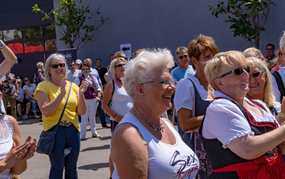 Zum Frühschoppen am Tag nachdem Schlager in Weiss kamen wieder ca.1500 Partyfreunde zum musikalischen Frühschoppen. Ochs am Spieß mit Knödel und Blaukraut war der Hit aus dem Catering von Stadelmann, aber auch gegrillte Ente war im Angebot. 15 Künstler traten in der Zeit von 13-17 Uhr auf, diesmal mit dem Scxhwerpunkt von Alpenrock. Es war ein schöner Tag!
