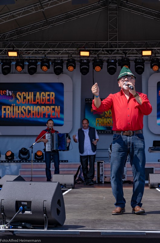 Zum Frühschoppen am Tag nachdem Schlager in Weiss kamen wieder ca.1500 Partyfreunde zum musikalischen Frühschoppen. Ochs am Spieß mit Knödel und Blaukraut war der Hit aus dem Catering von Stadelmann, aber auch gegrillte Ente war im Angebot. 15 Künstler traten in der Zeit von 13-17 Uhr auf, diesmal mit dem Scxhwerpunkt von Alpenrock. Es war ein schöner Tag!
