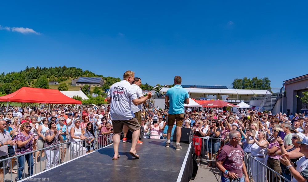 Zum Frühschoppen am Tag nachdem Schlager in Weiss kamen wieder ca.1500 Partyfreunde zum musikalischen Frühschoppen. Ochs am Spieß mit Knödel und Blaukraut war der Hit aus dem Catering von Stadelmann, aber auch gegrillte Ente war im Angebot. 15 Künstler traten in der Zeit von 13-17 Uhr auf, diesmal mit dem Scxhwerpunkt von Alpenrock. Es war ein schöner Tag!