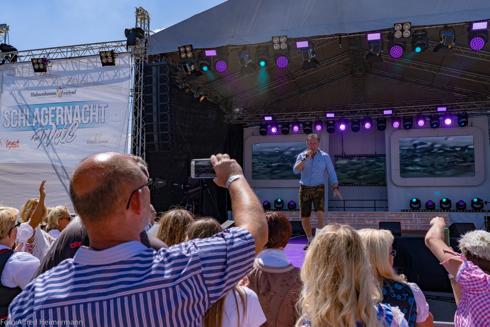 Zum Frühschoppen am Tag nachdem Schlager in Weiss kamen wieder ca.1500 Partyfreunde zum musikalischen Frühschoppen. Ochs am Spieß mit Knödel und Blaukraut war der Hit aus dem Catering von Stadelmann, aber auch gegrillte Ente war im Angebot. 15 Künstler traten in der Zeit von 13-17 Uhr auf, diesmal mit dem Scxhwerpunkt von Alpenrock. Es war ein schöner Tag!