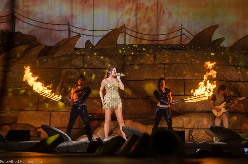 Seelenbeben mit Andrea Berg, Mannheim SAP-Arena Mannheim, 21.1.2017 10000 Besucher erlebten Andrea Berg bei ihrem Konzert in der Mannheimer SAP Arena und wurden bestens unterhalten. 2 junge Damen durften mit Andrea die Bühne betreten und ein Lioed mit ihr singen, man merkte ihnen die Freud an. Andrea fordete gegen Ende der Show zum Discofox auf und rief zur Damenwahl auf, was von ihren 3 Tänzerinnen und den beiden Backround Sängerinnen befolgt wurde, sie holten sich Männer aus dem Publikum und tanzten auf der Bühne, während Andrea sang. Ein neuer Gag der Show, der gut ankam. |