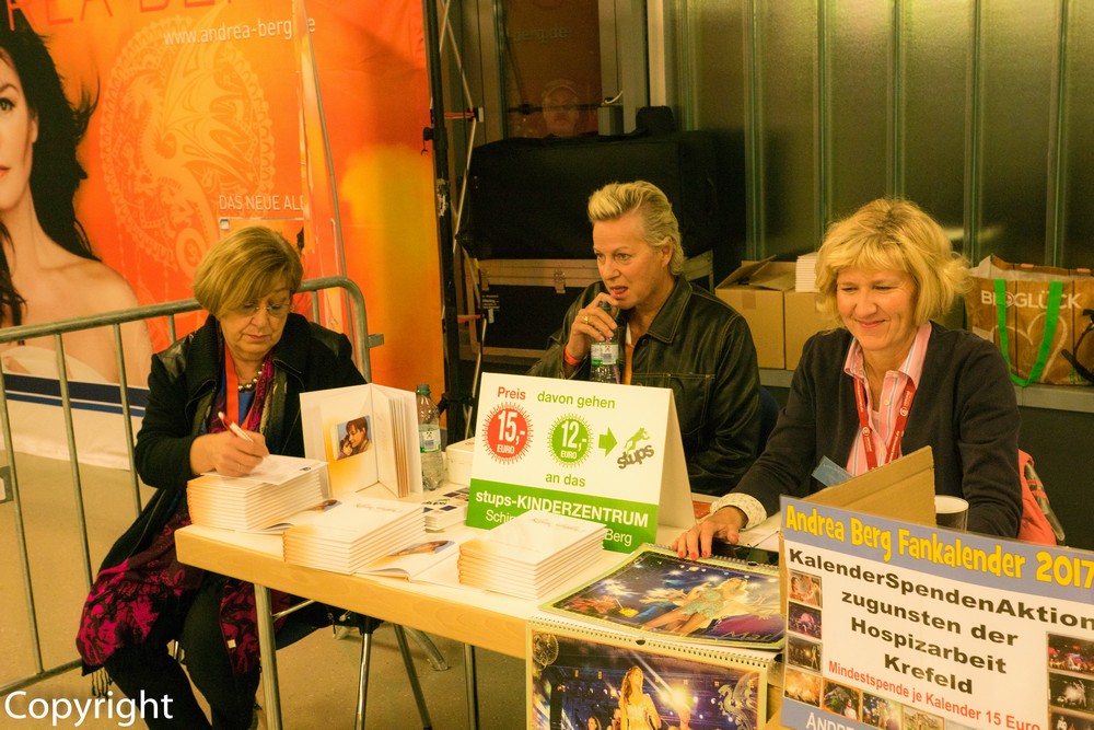 Ausverkauft war der Königspalast in Krefeld, wo Andrea am 14.10.2016 ihr Seelenbeben Tournee startete. Es war das erstenmal, dass sie in ihrer Heimadstadt gstierte und wurde dementsprechen gefeiert. Gut 500 Feuerwehrmänner und Karnevalisten der prinzengarde Krefeld begrüssten Andrea vor dem Königspalast. Die Feuerwehr war mit einem Rüstwagen aus den 50er Jahren anegrückt, den schon ihr Vater gefahren war, in seiner Zeit bei der Feuerwehr, was natürlich Andrea zu Tränen rührte. Das 1. Konzert der Tournee begeisterte die Krefelder und die angereisten Fans. Nach dem Konzert stand Andrea noch für alle für Fotos mit den Fans und Freunden zur Verfügung und freute sich ber viele Krefelder Nachbarn, Freunde und Bekannte...es war für sie ein besonderes Konzert. Der Fankalender vom FC Hennef fand guten Absatz, ebenso die Gedichtbücher von Karni Meincke (Bürgermeisterin von Krefeld und Vorsitzende der Hospizstiftung Krefleld). Der Erlös der Bücher und der Fankalender kommt der Hospizarbeit Krefled zu Gute.
