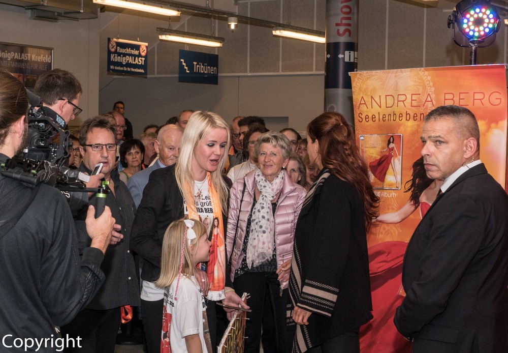 Tourstart Andrea Berg in Krefeld und mein 300. Konzert von Andrea Krefeld, Königspalast Ausverkauft war der Königspalast in Krefeld, wo Andrea am 14.10.2016 ihr Seelenbeben Tournee startete. Es war das erstenmal, dass sie in ihrer Heimadstadt gstierte und wurde dementsprechen gefeiert. Gut 500 Feuerwehrmänner und Karnevalisten der prinzengarde Krefeld begrüssten Andrea vor dem Königspalast. Die Feuerwehr war mit einem Rüstwagen aus den 50er Jahren anegrückt, den schon ihr Vater gefahren war, in seiner Zeit bei der Feuerwehr, was natürlich Andrea zu Tränen rührte. Das 1. Konzert der Tournee begeisterte die Krefelder und die angereisten Fans. Nach dem Konzert stand Andrea noch für alle für Fotos mit den Fans und Freunden zur Verfügung und freute sich ber viele Krefelder Nachbarn, Freunde und Bekannte...es war für sie ein besonderes Konzert. Der Fankalender vom FC Hennef fand guten Absatz, ebenso die Gedichtbücher von Karni Meincke (Bürgermeisterin von Krefeld und Vorsitzende der Hospizstiftung Krefleld). Der Erlös der Bücher und der Fankalender kommt der Hospizarbeit Krefled zu Gute. |