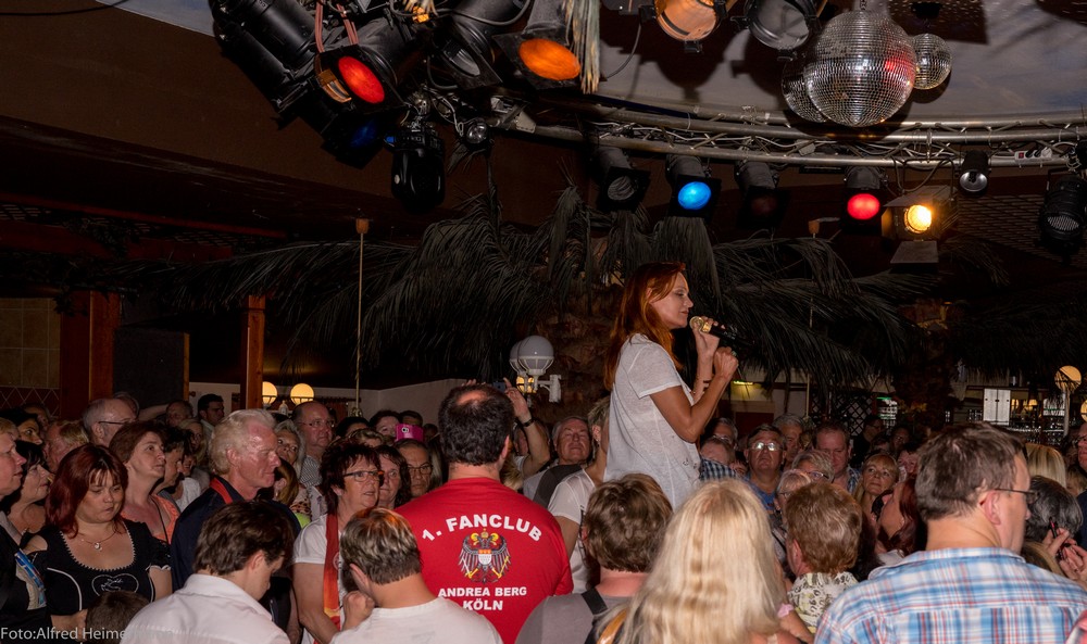 Es war ein schöner Sonnentag in Aspach und alles wirkte so grün um den Sonnenhof herum. In der Hazienda war es auch angenehm, da man gut lüftete und es war auch nicht so voll wie sonst. Viele fremde Gesichter im Publikum, denke die meisten Hardcorefans kommen zum Konzert am 7.6., aöso nach Pfingsten. Andrea erzählte von ihrem 25-jährigen Bühnenjubiläum als Andrea Berg und stellte die bislang in der Gunst der Fans beliebtesten 25 Songs vor. Sie erzählte auch, dass sie mit dem Jubiläumsalbum dann auf Tour geht, aber nicht in Arenen, sondern wie früher in 25 kleine Clubs. Natürlich stand sie nachdem Konzert für Fotos bereit.