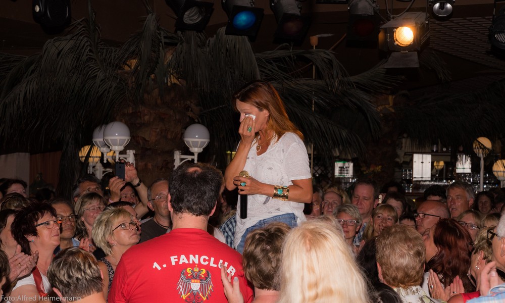 Es war ein schöner Sonnentag in Aspach und alles wirkte so grün um den Sonnenhof herum. In der Hazienda war es auch angenehm, da man gut lüftete und es war auch nicht so voll wie sonst. Viele fremde Gesichter im Publikum, denke die meisten Hardcorefans kommen zum Konzert am 7.6., aöso nach Pfingsten. Andrea erzählte von ihrem 25-jährigen Bühnenjubiläum als Andrea Berg und stellte die bislang in der Gunst der Fans beliebtesten 25 Songs vor. Sie erzählte auch, dass sie mit dem Jubiläumsalbum dann auf Tour geht, aber nicht in Arenen, sondern wie früher in 25 kleine Clubs. Natürlich stand sie nachdem Konzert für Fotos bereit.