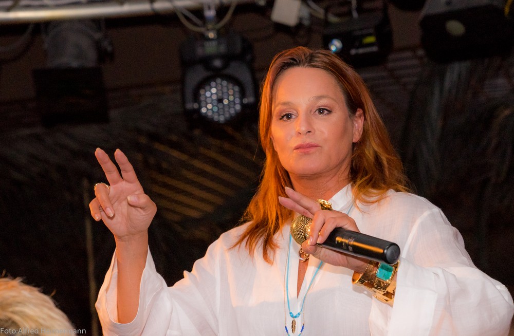 Es war ein schöner Sonnentag in Aspach und alles wirkte so grün um den Sonnenhof herum. In der Hazienda war es auch angenehm, da man gut lüftete und es war auch nicht so voll wie sonst. Viele fremde Gesichter im Publikum, denke die meisten Hardcorefans kommen zum Konzert am 7.6., aöso nach Pfingsten. Andrea erzählte von ihrem 25-jährigen Bühnenjubiläum als Andrea Berg und stellte die bislang in der Gunst der Fans beliebtesten 25 Songs vor. Sie erzählte auch, dass sie mit dem Jubiläumsalbum dann auf Tour geht, aber nicht in Arenen, sondern wie früher in 25 kleine Clubs. Natürlich stand sie nachdem Konzert für Fotos bereit.