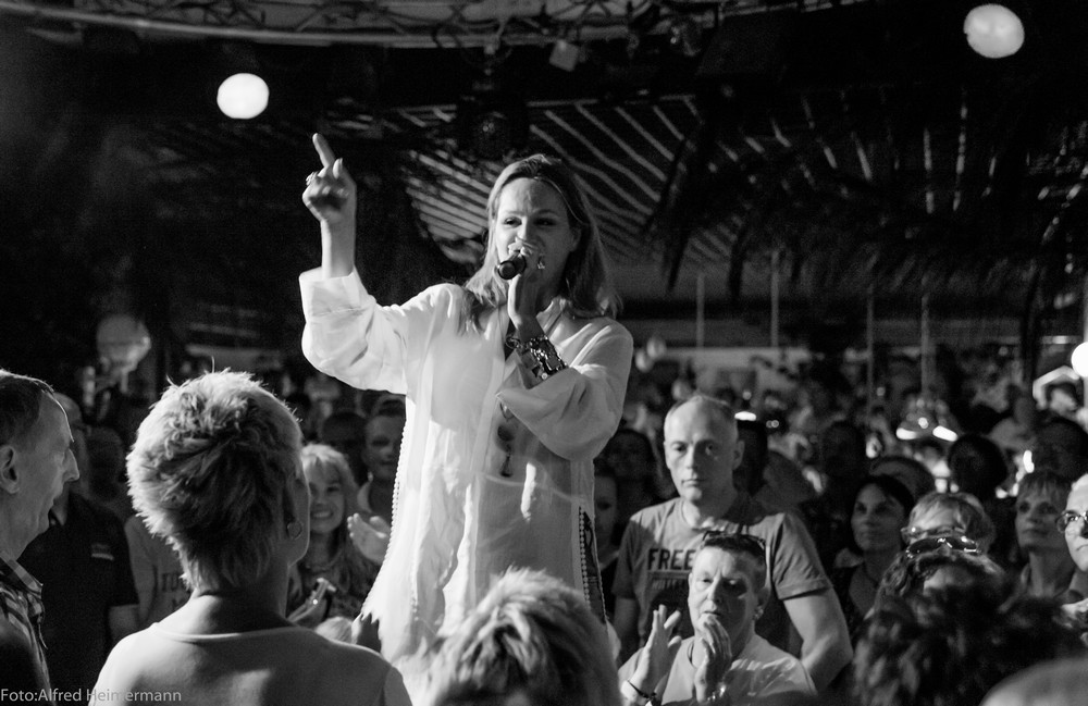 Es war ein schöner Sonnentag in Aspach und alles wirkte so grün um den Sonnenhof herum. In der Hazienda war es auch angenehm, da man gut lüftete und es war auch nicht so voll wie sonst. Viele fremde Gesichter im Publikum, denke die meisten Hardcorefans kommen zum Konzert am 7.6., aöso nach Pfingsten. Andrea erzählte von ihrem 25-jährigen Bühnenjubiläum als Andrea Berg und stellte die bislang in der Gunst der Fans beliebtesten 25 Songs vor. Sie erzählte auch, dass sie mit dem Jubiläumsalbum dann auf Tour geht, aber nicht in Arenen, sondern wie früher in 25 kleine Clubs. Natürlich stand sie nachdem Konzert für Fotos bereit.