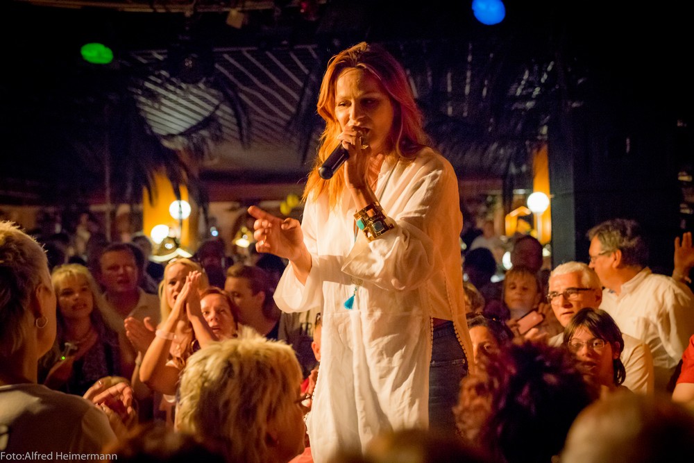Es war ein schöner Sonnentag in Aspach und alles wirkte so grün um den Sonnenhof herum. In der Hazienda war es auch angenehm, da man gut lüftete und es war auch nicht so voll wie sonst. Viele fremde Gesichter im Publikum, denke die meisten Hardcorefans kommen zum Konzert am 7.6., aöso nach Pfingsten. Andrea erzählte von ihrem 25-jährigen Bühnenjubiläum als Andrea Berg und stellte die bislang in der Gunst der Fans beliebtesten 25 Songs vor. Sie erzählte auch, dass sie mit dem Jubiläumsalbum dann auf Tour geht, aber nicht in Arenen, sondern wie früher in 25 kleine Clubs. Natürlich stand sie nachdem Konzert für Fotos bereit.