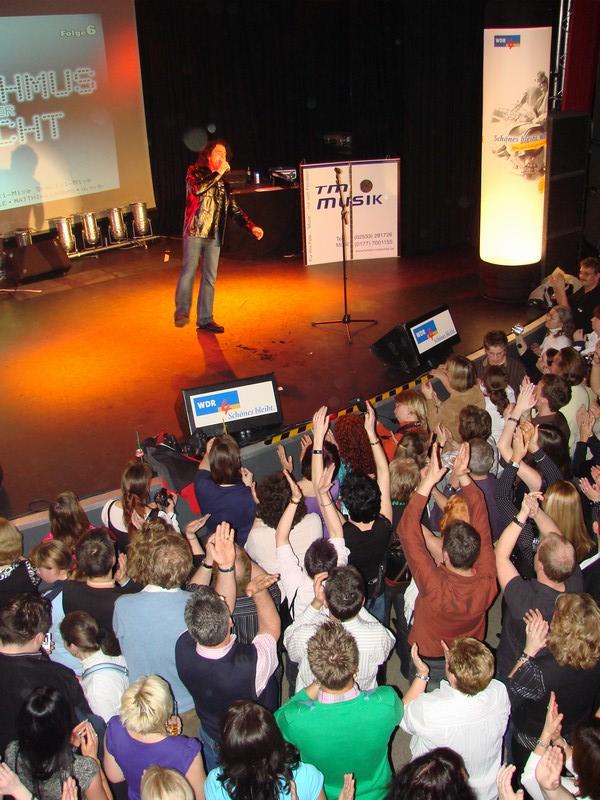 WDR4-Rythmus der Nacht WDR4 12 Künstler waren auf das Rhein-Energie-Schiff der KD am Freitag den 27.3.2009 zum Ryhtmus der Nacht gekommen um mit 1300 Fans eine tolle Party zu feiren, die bis tief in die Nacht dauerte. Mit dabei waren: Andreas Martin, Gaby Baginsky, Fantasy, Oliver Frank, Christian Anders,G.G. Anderson, Sandy Wagner, Nico Gemga, Oliver Lukas, Mattias Carras, Lukas Bach und Anna Katharina Stoll. Präsentiert wurde die Party von Herrn Brügggemann und von Begasse. |