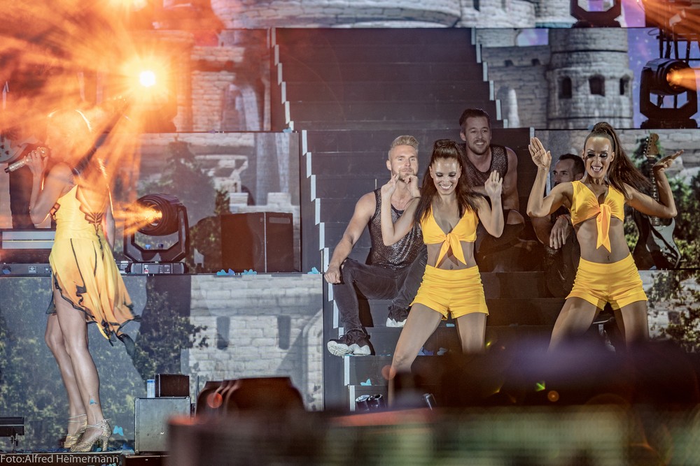 13._Heimspiel_Andrea_Berg__Freitag(1) Mechatronikarena Aspach, 20.7.2018 15000 Besucher waren zum 1. Konzert des 13. Andrea Berg Heimspiel in die Arena in der Fautenau gekommen. Durch die Hitze waren im Vorprogramm nicht soviele Fans wie sonst an der Bühne. Rebel Tell und Sunrise waren Künstler, die im Vorprogramm für die meiste Stimmung sorgten, aber es traten noch andere Künstler auf, u.a. eine Sängerin aus Kleinaspach. Gegen 21 Uhr dann der große Moment, als der Schmetterlingvorhang fiel und Andrea ihr 3 stündiges Konzert begann, sie strahlte mit einem lächeln den ganzen Abend, man merkte, sie freute sich, so wie auch ihre Fans. Mit einem großen Feuerwerk endete ein schöner Sommerabend. |