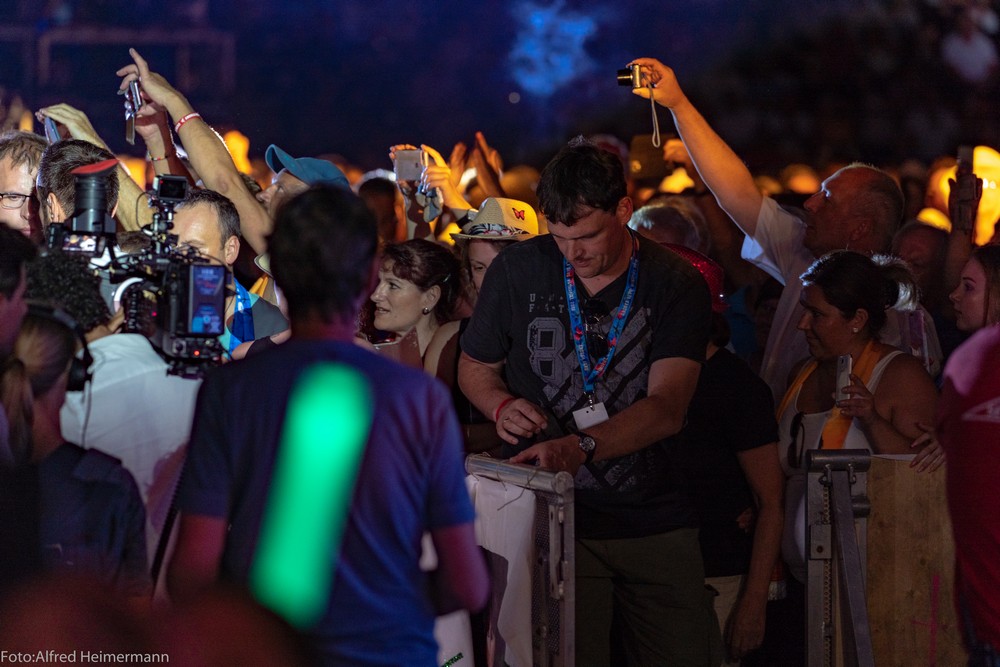 13._Heimspiel_Andrea_Berg__Freitag(1) Mechatronikarena Aspach, 20.7.2018 15000 Besucher waren zum 1. Konzert des 13. Andrea Berg Heimspiel in die Arena in der Fautenau gekommen. Durch die Hitze waren im Vorprogramm nicht soviele Fans wie sonst an der Bühne. Rebel Tell und Sunrise waren Künstler, die im Vorprogramm für die meiste Stimmung sorgten, aber es traten noch andere Künstler auf, u.a. eine Sängerin aus Kleinaspach. Gegen 21 Uhr dann der große Moment, als der Schmetterlingvorhang fiel und Andrea ihr 3 stündiges Konzert begann, sie strahlte mit einem lächeln den ganzen Abend, man merkte, sie freute sich, so wie auch ihre Fans. Mit einem großen Feuerwerk endete ein schöner Sommerabend. |