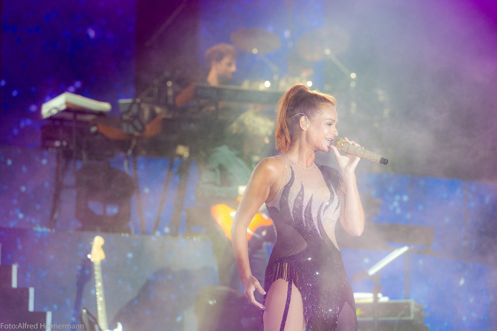 13._Heimspiel_Andrea_Berg__Freitag(1) Mechatronikarena Aspach, 20.7.2018 15000 Besucher waren zum 1. Konzert des 13. Andrea Berg Heimspiel in die Arena in der Fautenau gekommen. Durch die Hitze waren im Vorprogramm nicht soviele Fans wie sonst an der Bühne. Rebel Tell und Sunrise waren Künstler, die im Vorprogramm für die meiste Stimmung sorgten, aber es traten noch andere Künstler auf, u.a. eine Sängerin aus Kleinaspach. Gegen 21 Uhr dann der große Moment, als der Schmetterlingvorhang fiel und Andrea ihr 3 stündiges Konzert begann, sie strahlte mit einem lächeln den ganzen Abend, man merkte, sie freute sich, so wie auch ihre Fans. Mit einem großen Feuerwerk endete ein schöner Sommerabend. |