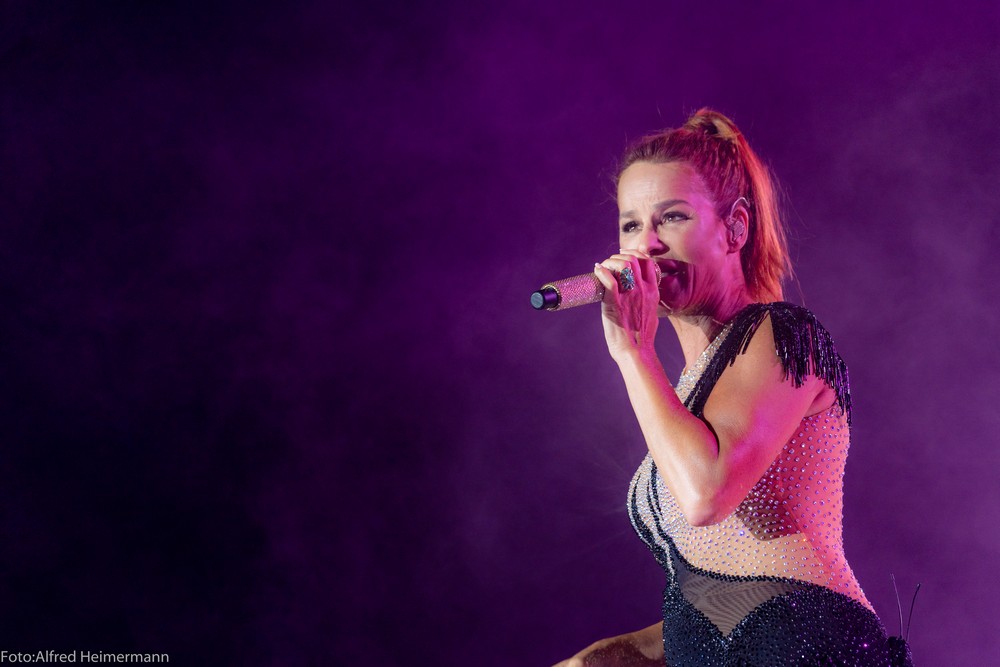 13._Heimspiel_Andrea_Berg__Freitag(1) Mechatronikarena Aspach, 20.7.2018 15000 Besucher waren zum 1. Konzert des 13. Andrea Berg Heimspiel in die Arena in der Fautenau gekommen. Durch die Hitze waren im Vorprogramm nicht soviele Fans wie sonst an der Bühne. Rebel Tell und Sunrise waren Künstler, die im Vorprogramm für die meiste Stimmung sorgten, aber es traten noch andere Künstler auf, u.a. eine Sängerin aus Kleinaspach. Gegen 21 Uhr dann der große Moment, als der Schmetterlingvorhang fiel und Andrea ihr 3 stündiges Konzert begann, sie strahlte mit einem lächeln den ganzen Abend, man merkte, sie freute sich, so wie auch ihre Fans. Mit einem großen Feuerwerk endete ein schöner Sommerabend. |