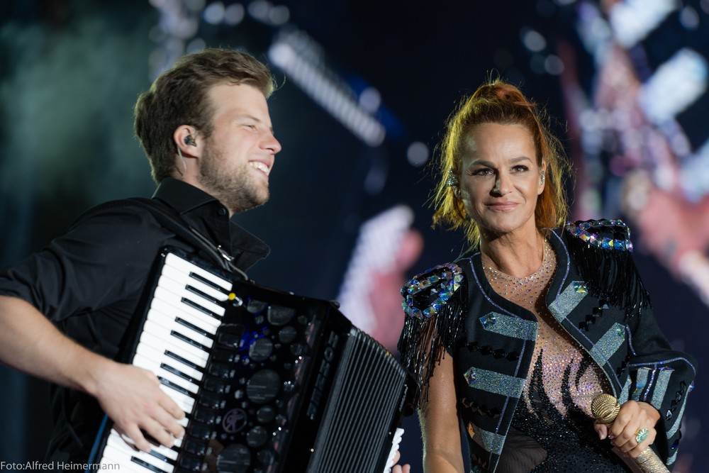 13._Heimspiel_Andrea_Berg__Freitag(1) Mechatronikarena Aspach, 20.7.2018 15000 Besucher waren zum 1. Konzert des 13. Andrea Berg Heimspiel in die Arena in der Fautenau gekommen. Durch die Hitze waren im Vorprogramm nicht soviele Fans wie sonst an der Bühne. Rebel Tell und Sunrise waren Künstler, die im Vorprogramm für die meiste Stimmung sorgten, aber es traten noch andere Künstler auf, u.a. eine Sängerin aus Kleinaspach. Gegen 21 Uhr dann der große Moment, als der Schmetterlingvorhang fiel und Andrea ihr 3 stündiges Konzert begann, sie strahlte mit einem lächeln den ganzen Abend, man merkte, sie freute sich, so wie auch ihre Fans. Mit einem großen Feuerwerk endete ein schöner Sommerabend. |