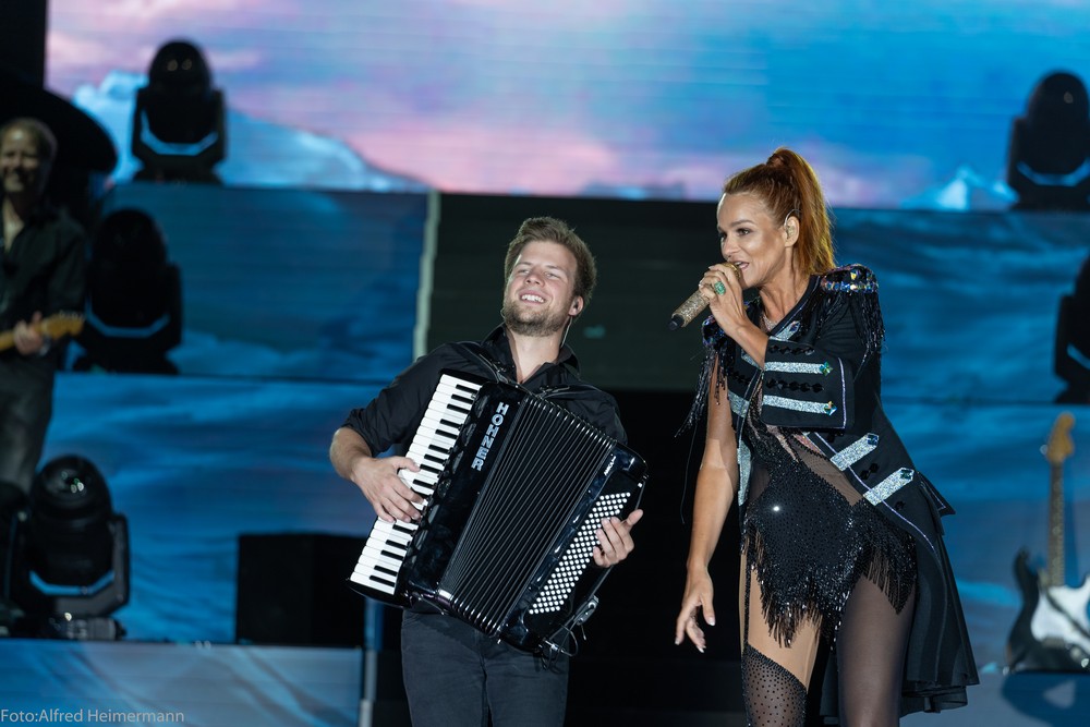 13._Heimspiel_Andrea_Berg__Freitag(1) Mechatronikarena Aspach, 20.7.2018 15000 Besucher waren zum 1. Konzert des 13. Andrea Berg Heimspiel in die Arena in der Fautenau gekommen. Durch die Hitze waren im Vorprogramm nicht soviele Fans wie sonst an der Bühne. Rebel Tell und Sunrise waren Künstler, die im Vorprogramm für die meiste Stimmung sorgten, aber es traten noch andere Künstler auf, u.a. eine Sängerin aus Kleinaspach. Gegen 21 Uhr dann der große Moment, als der Schmetterlingvorhang fiel und Andrea ihr 3 stündiges Konzert begann, sie strahlte mit einem lächeln den ganzen Abend, man merkte, sie freute sich, so wie auch ihre Fans. Mit einem großen Feuerwerk endete ein schöner Sommerabend. |