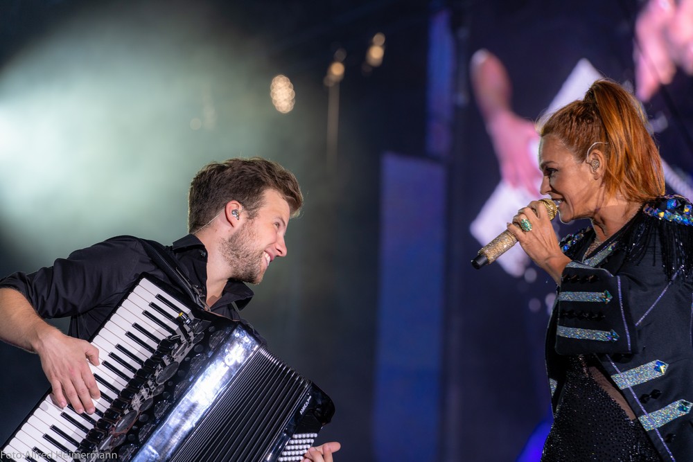 13._Heimspiel_Andrea_Berg__Freitag(1) Mechatronikarena Aspach, 20.7.2018 15000 Besucher waren zum 1. Konzert des 13. Andrea Berg Heimspiel in die Arena in der Fautenau gekommen. Durch die Hitze waren im Vorprogramm nicht soviele Fans wie sonst an der Bühne. Rebel Tell und Sunrise waren Künstler, die im Vorprogramm für die meiste Stimmung sorgten, aber es traten noch andere Künstler auf, u.a. eine Sängerin aus Kleinaspach. Gegen 21 Uhr dann der große Moment, als der Schmetterlingvorhang fiel und Andrea ihr 3 stündiges Konzert begann, sie strahlte mit einem lächeln den ganzen Abend, man merkte, sie freute sich, so wie auch ihre Fans. Mit einem großen Feuerwerk endete ein schöner Sommerabend. |