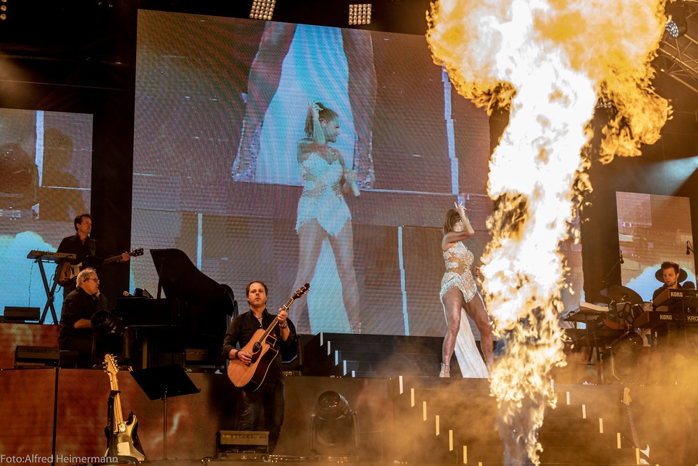13._Heimspiel_Andrea_Berg__Freitag(1) Mechatronikarena Aspach, 20.7.2018 15000 Besucher waren zum 1. Konzert des 13. Andrea Berg Heimspiel in die Arena in der Fautenau gekommen. Durch die Hitze waren im Vorprogramm nicht soviele Fans wie sonst an der Bühne. Rebel Tell und Sunrise waren Künstler, die im Vorprogramm für die meiste Stimmung sorgten, aber es traten noch andere Künstler auf, u.a. eine Sängerin aus Kleinaspach. Gegen 21 Uhr dann der große Moment, als der Schmetterlingvorhang fiel und Andrea ihr 3 stündiges Konzert begann, sie strahlte mit einem lächeln den ganzen Abend, man merkte, sie freute sich, so wie auch ihre Fans. Mit einem großen Feuerwerk endete ein schöner Sommerabend. |