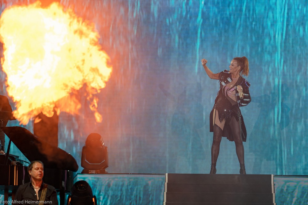 13._Heimspiel_Andrea_Berg__Freitag(1) Mechatronikarena Aspach, 20.7.2018 15000 Besucher waren zum 1. Konzert des 13. Andrea Berg Heimspiel in die Arena in der Fautenau gekommen. Durch die Hitze waren im Vorprogramm nicht soviele Fans wie sonst an der Bühne. Rebel Tell und Sunrise waren Künstler, die im Vorprogramm für die meiste Stimmung sorgten, aber es traten noch andere Künstler auf, u.a. eine Sängerin aus Kleinaspach. Gegen 21 Uhr dann der große Moment, als der Schmetterlingvorhang fiel und Andrea ihr 3 stündiges Konzert begann, sie strahlte mit einem lächeln den ganzen Abend, man merkte, sie freute sich, so wie auch ihre Fans. Mit einem großen Feuerwerk endete ein schöner Sommerabend. |