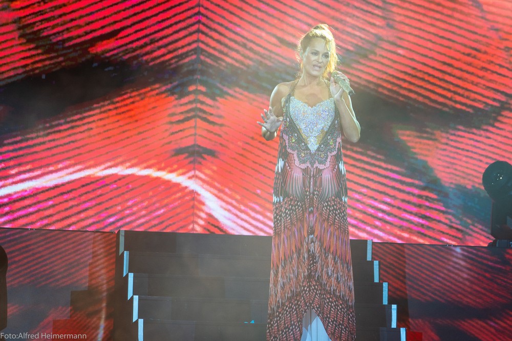 13._Heimspiel_Andrea_Berg__Freitag(1) Mechatronikarena Aspach, 20.7.2018 15000 Besucher waren zum 1. Konzert des 13. Andrea Berg Heimspiel in die Arena in der Fautenau gekommen. Durch die Hitze waren im Vorprogramm nicht soviele Fans wie sonst an der Bühne. Rebel Tell und Sunrise waren Künstler, die im Vorprogramm für die meiste Stimmung sorgten, aber es traten noch andere Künstler auf, u.a. eine Sängerin aus Kleinaspach. Gegen 21 Uhr dann der große Moment, als der Schmetterlingvorhang fiel und Andrea ihr 3 stündiges Konzert begann, sie strahlte mit einem lächeln den ganzen Abend, man merkte, sie freute sich, so wie auch ihre Fans. Mit einem großen Feuerwerk endete ein schöner Sommerabend. |