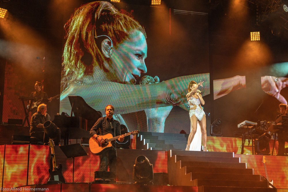 13._Heimspiel_Andrea_Berg__Freitag(1) Mechatronikarena Aspach, 20.7.2018 15000 Besucher waren zum 1. Konzert des 13. Andrea Berg Heimspiel in die Arena in der Fautenau gekommen. Durch die Hitze waren im Vorprogramm nicht soviele Fans wie sonst an der Bühne. Rebel Tell und Sunrise waren Künstler, die im Vorprogramm für die meiste Stimmung sorgten, aber es traten noch andere Künstler auf, u.a. eine Sängerin aus Kleinaspach. Gegen 21 Uhr dann der große Moment, als der Schmetterlingvorhang fiel und Andrea ihr 3 stündiges Konzert begann, sie strahlte mit einem lächeln den ganzen Abend, man merkte, sie freute sich, so wie auch ihre Fans. Mit einem großen Feuerwerk endete ein schöner Sommerabend. |